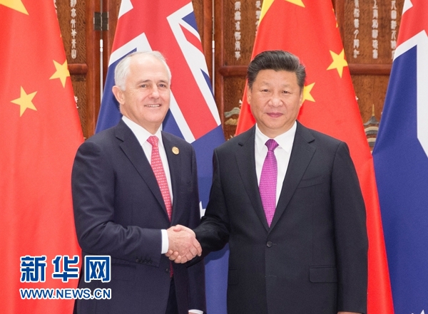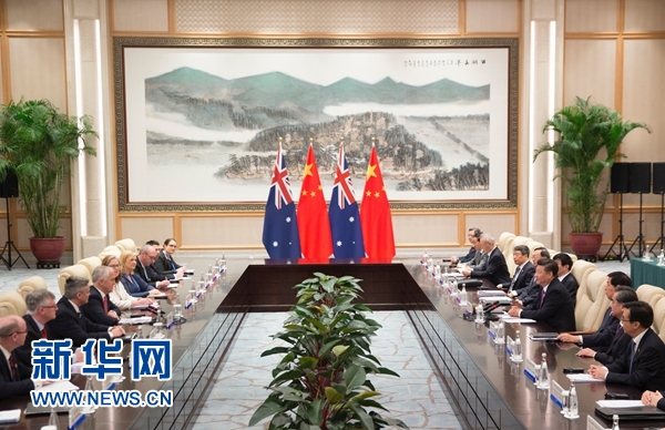 習近平指出,中方高度重視發展中澳關系。希望雙方相向而行,堅持互信互利原則,拓展務實合作,擴大人文交流,推動中澳全面戰略伙伴關系健康穩定向前發展?;バ攀潜WC中澳關系順利發展的前提。中澳要尊重彼此對發展道路的選擇,尊重彼此核心利益和重大關切。我們要加強優勢互補,繼續實施好中澳自由貿易協定,加快推進中方“一帶一路”倡議同澳方“北部大開發”計劃對接,積極拓展能源資源、農牧業、食品加工、基礎設施建設等領域合作,更好實現互利雙贏。希望澳方繼續致力于為外資提供公平、透明、可預期的政策環境,這也符合澳方自身利益。要深入推進創新發展戰略對接,擴大食品、農業、礦業、海洋科學等領域聯合研發。要深化教育、文化、旅游等領域交流,增進兩國人民相互了解和友誼。要加強反腐敗追逃追贓和反恐合作。中方愿同澳方加強在聯合國、二十國集團、亞太經合組織、東亞峰會等機制中的協調和合作。