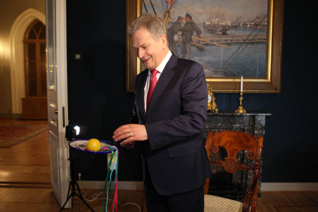 4月3日,赫爾辛基,芬蘭總統尼尼斯托看到新華社記者贈送的太極柔力球高興得親自玩了幾下。(新華社記者張璇攝)