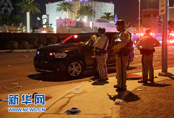 10月2日,在美國(guó)西部城市拉斯維加斯,警察在槍擊事件現(xiàn)場(chǎng)警戒。新華社/美聯(lián)