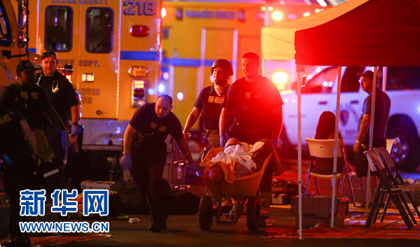 10月1日,在美國(guó)西部城市拉斯維加斯,工作人員在槍擊事件現(xiàn)場(chǎng)救治傷者。新華社/美聯(lián)