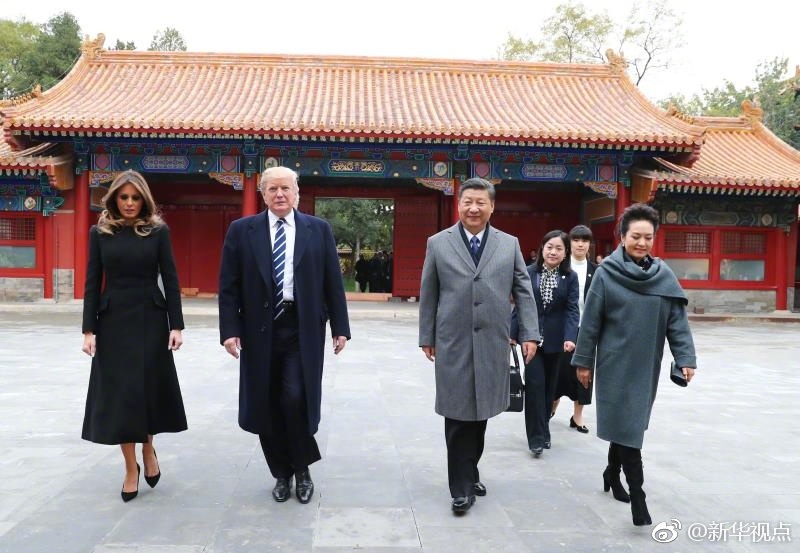 新華網北京11月8日電? 國家主席習近平和夫人彭麗媛11月8日陪同來華進行國事訪問的美國總統特朗普和夫人梅拉尼婭參觀故宮博物院。(攝影:新華社記者蘭紅光、劉衛兵、謝環馳 據新華社“新華視點”微博報道)