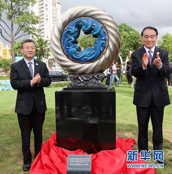 11月9日,在越南峴港APEC公園,中國(guó)外交部副部長(zhǎng)李保東(右)、商務(wù)部副部長(zhǎng)王受文(左)共同為中國(guó)贈(zèng)送的雕塑作品《和夢(mèng)同圓》揭幕。作為2017年亞太經(jīng)合組織(APEC)領(lǐng)導(dǎo)人會(huì)議周的一部分,越南峴港APEC公園9日正式開(kāi)放,展示21個(gè)成員經(jīng)濟(jì)體藝術(shù)家創(chuàng)作的雕塑。新華社記者李鵬攝