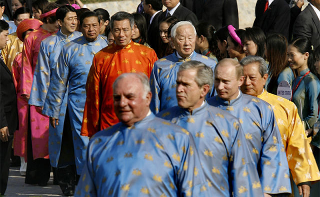 2006年,APEC領(lǐng)導(dǎo)人非正式會議在越南舉辦。當(dāng)年,各經(jīng)濟體領(lǐng)導(dǎo)人穿的是越南傳統(tǒng)服裝——奧黛。