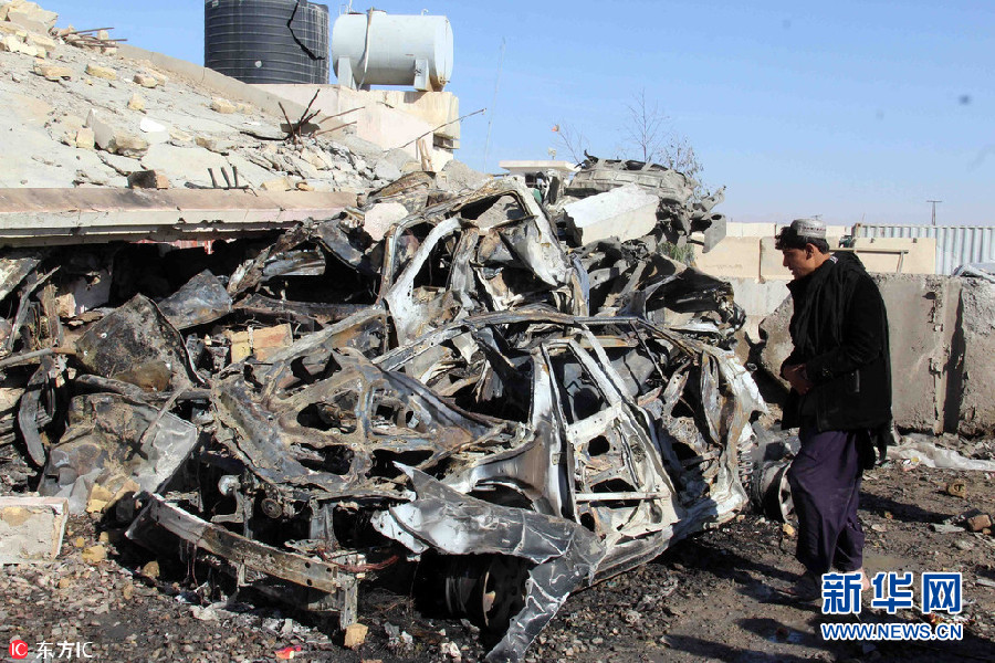當地時間22日,阿富汗坎大哈,當地一處警察總部遭遇自殺式汽車炸彈襲擊,造成至少6名警察死亡,4人受傷。圖為阿富汗安全官員檢查現場。(圖片來源:東方IC)