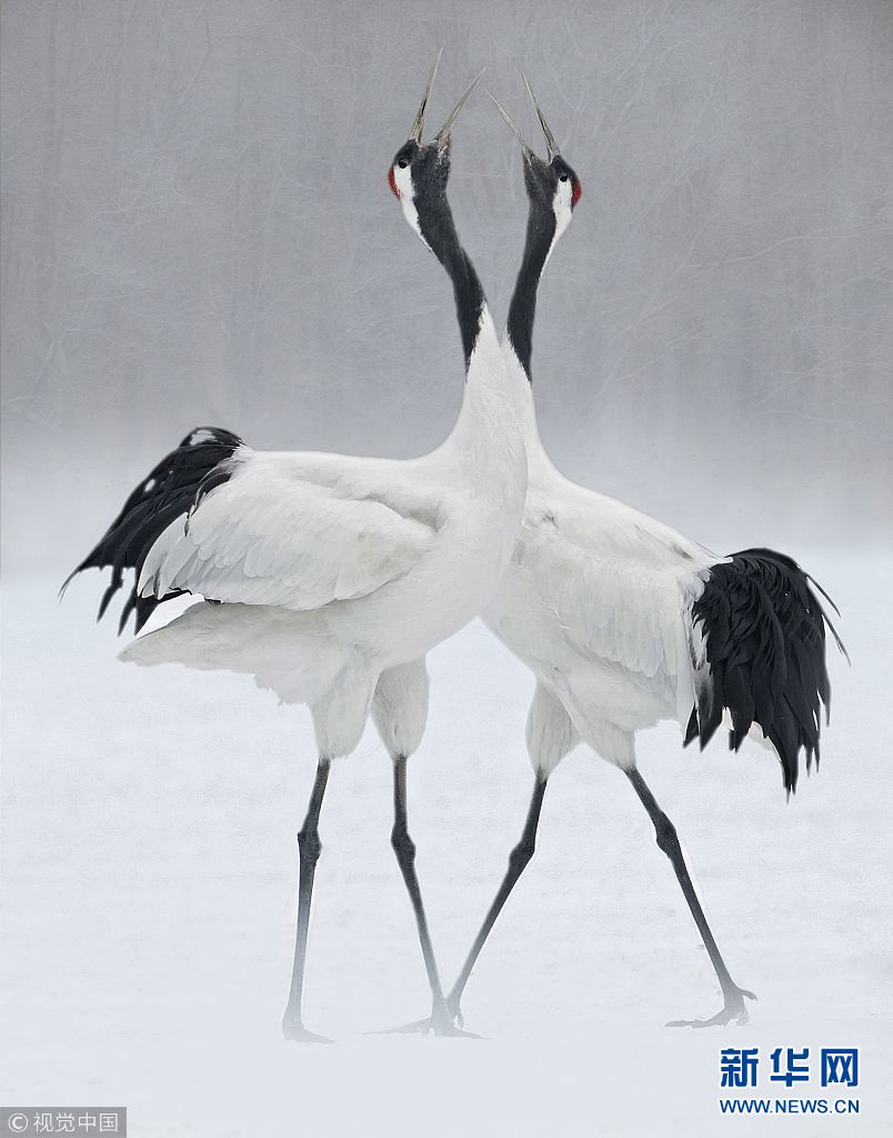 12月25日訊(具體拍攝時間不詳),日本北海道,一對丹頂鶴在冰面上翩翩起舞,動作驚人一致。(圖片來源:視覺中國)