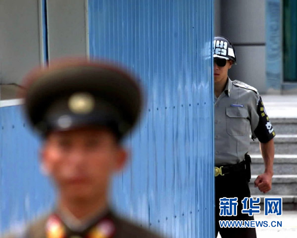 2002年9月19日拍攝的資料照片顯示,一名韓國憲兵(右)和一名朝鮮人民軍士兵在板門店朝鮮半島軍事分界線兩側執勤。 新華社記者龔兵攝