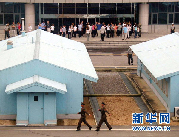 2004年7月26日拍攝的資料照片顯示,來自世界各國的游客在板門店韓國一側(上)參觀,畫面下部為板門店朝鮮一側兩名正在執勤的朝鮮人民軍士兵。新華社記者姬新龍攝