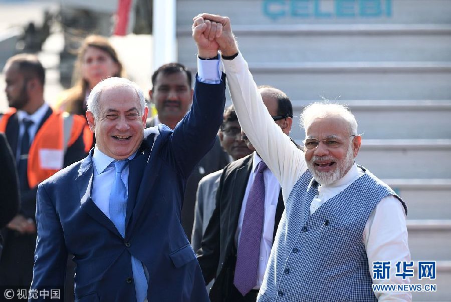 當地時間1月14日,印度新德里,以色列總理內塔尼亞胡抵達印度展開訪問。(圖片來源:視覺中國)
