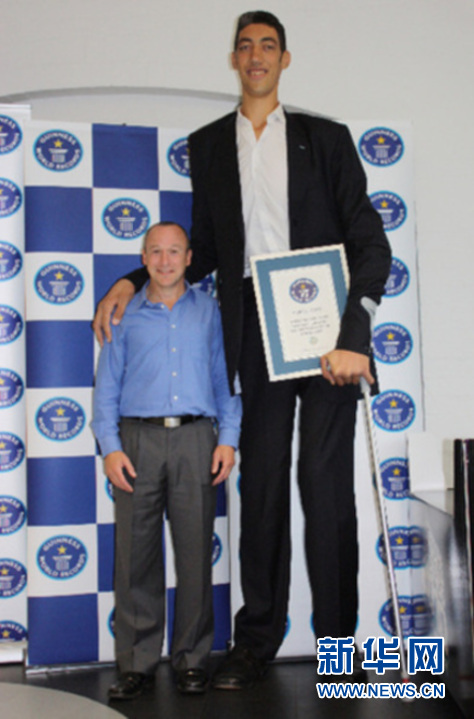 資料圖片:吉尼斯世界紀錄全球總裁阿里斯塔爾·理查茲(左)與“世界上最高的人(在世)”蘇爾坦(土耳其籍)合影。(吉尼斯世界紀錄供圖)