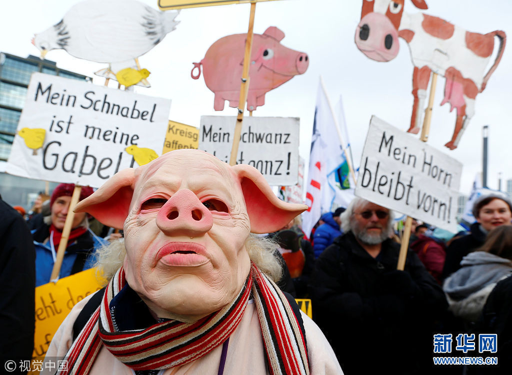 當地時間1月20日,德國柏林,農民們裝扮成家畜游行,抗議柏林國際綠色周舉行,要求更多生態農業項目。 (圖片來源:視覺中國)