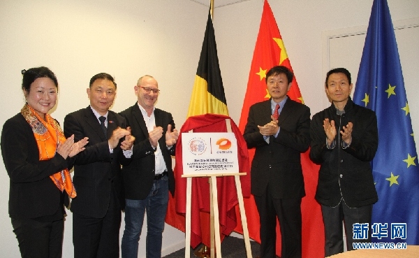 中國(guó)駐歐盟使團(tuán)公使銜參贊李建民(前排左二)、中國(guó)駐比利時(shí)大使館文化參贊向世海(前排右一)、湖南衛(wèi)視國(guó)際頻道總監(jiān)甘霖(前排右二)和比利時(shí)法語廣播電視臺(tái)的特別代表(前排左三)共同為聯(lián)絡(luò)處揭牌。新華網(wǎng)發(fā)(潘革平攝)