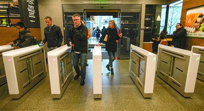 Amazon Go占地約167平方米,包括員工在內可容納97人。進入店內購物前,先要下載相關智能手機應用,并通過手機掃碼進入一個類似于地鐵站的閘機口。進入店內,首先映入眼簾的是可以直接食用的午餐食品,接著是肉類和餐具等雜貨。借助天花板上的大量黑色攝像頭和貨架上的重量傳感器,店方能探測何人取走了貨物。如果有人拿著商品走出閘門,其關聯賬號就會扣費。反之,如果消費者把商品放回貨架,商品則從虛擬購物車中刪除。顧客購物結束后直接通過閘機口離店,幾分鐘后將收到亞馬遜發送的電子收據。