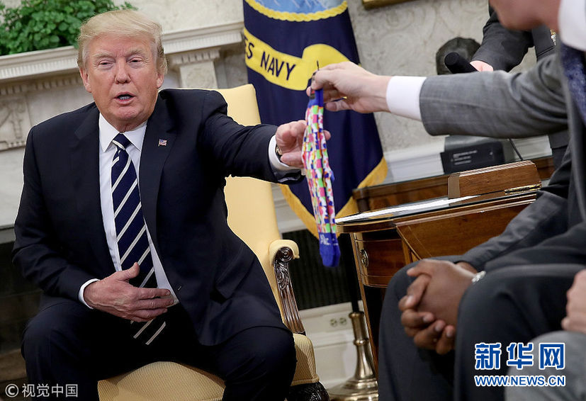 當地時間1月31日,美國華盛頓,美國總統特朗普在白宮與公司雇員討論稅收改革問題,獲贈一雙襪子。(圖片來源:視覺中國)