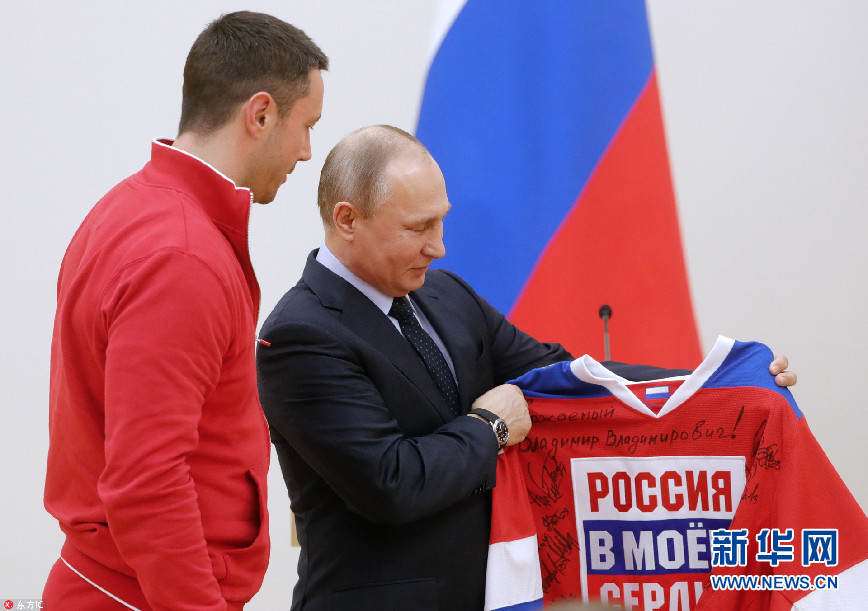 當(dāng)?shù)貢r(shí)間1月31日,俄羅斯莫斯科,普京會(huì)見(jiàn)征戰(zhàn)平昌冬奧會(huì)的俄羅斯運(yùn)動(dòng)員,獲俄冰球隊(duì)贈(zèng)送簽名球衣。(圖片來(lái)源:東方IC)