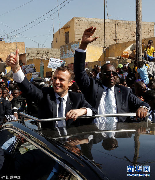 當(dāng)?shù)貢r(shí)間2月3日,塞內(nèi)加爾圣路易,塞內(nèi)加爾總統(tǒng)馬基·薩勒陪到訪的法國(guó)總統(tǒng)馬克龍?jiān)煸L當(dāng)?shù)兀瑑扇顺塑囅蛎癖娭乱狻#▓D片來源:視覺中國(guó))