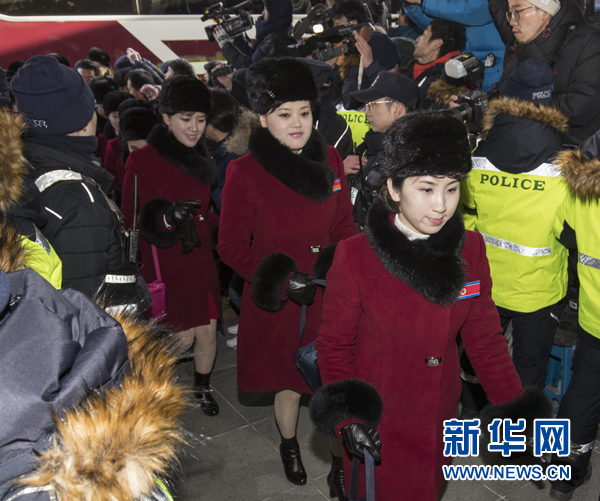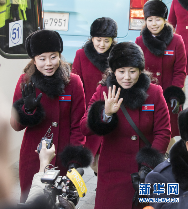 2月7日,朝鮮拉拉隊成員乘車到達韓國江原道麟蹄郡。當日,參加平昌冬奧會的朝鮮拉拉隊、跆拳道示范團、記者團和民族奧林匹克委員會官員等一行280人經(jīng)由京義線陸路抵達韓國境內(nèi)。新華社發(fā)(李相浩攝)