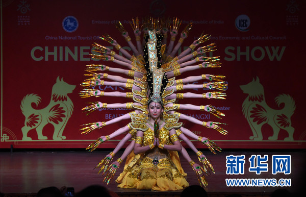 2月9日,在印度首都新德里,2018“歡樂春節(jié)”活動(dòng)演出現(xiàn)場,中國演員在表演舞蹈。新華網(wǎng)發(fā)(張迺杰攝)