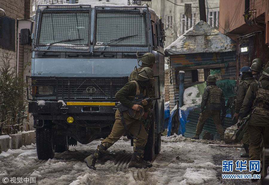 2月12日,印控克什米爾斯利那加,印度政府軍與疑似激進分子展開槍戰。兩名持槍歹徒在他們的營地附近開火致一名印度準軍事部隊士兵死亡。(圖片來源:視覺中國)