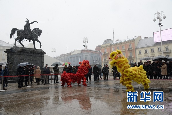 當地時間12日中午,來自斯洛伐克中國武術協會的舞獅表演隊冒雪表演傳統舞獅節目,中國駐克羅地亞大使胡兆明和薩格勒布市長米蘭·班迪奇為舞獅點睛,熱鬧的鑼鼓和一紅一黃兩頭“獅子”吸引了大批市民駐足觀看。