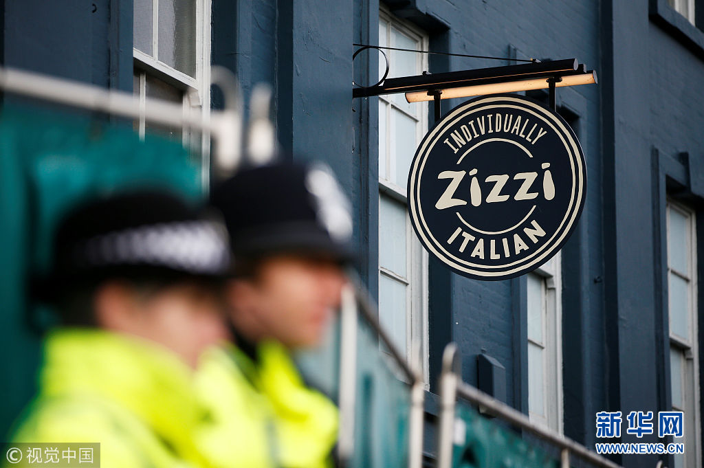 當地時間2018年3月11日,英國索爾茲伯里市,Zizzi餐廳關閉進行調查工作。警方在威爾特郡索爾茲伯里市一家意大利餐廳發現神經毒劑的痕跡,斯克里帕爾父女中毒前在那里用餐。(圖片來源:視覺中國)
