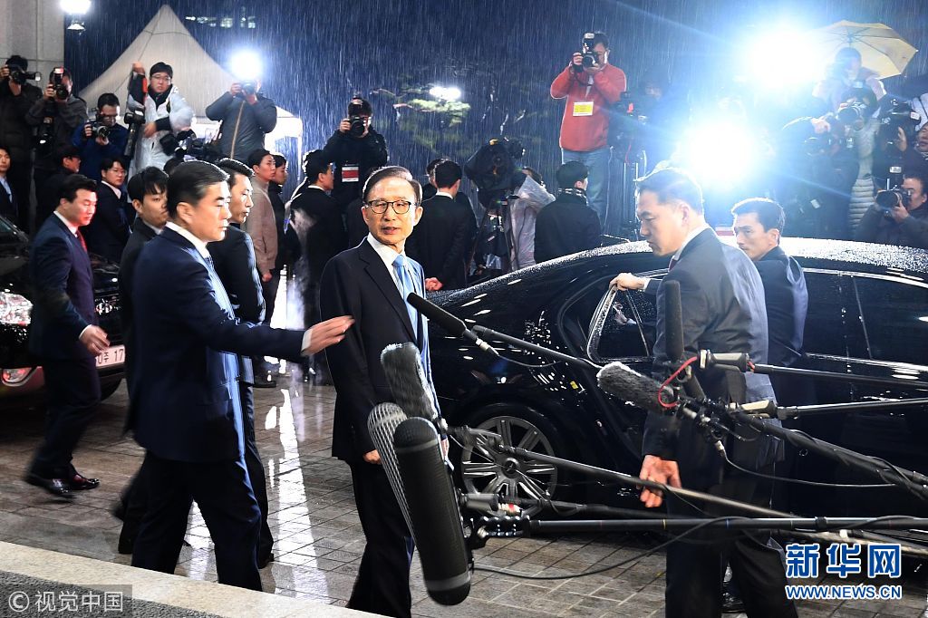 3月15日,韓國首爾,韓國前總統李明博在接受了檢方超過21小時的調查后返家。他涉嫌包括受賄、挪用公款等在內的20多項罪名,同時也是韓國第五位被檢方調查的前總統。(圖片來源:視覺中國)