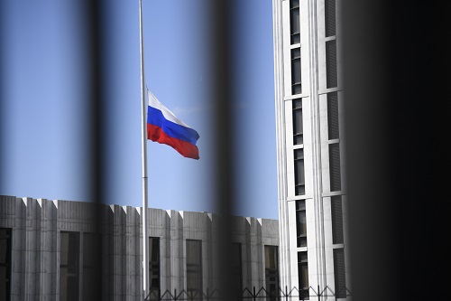 這是3月26日在美國首都華盛頓拍攝的俄羅斯駐美國大使館內(nèi)的俄羅斯國旗。新華社記者楊承霖?cái)z