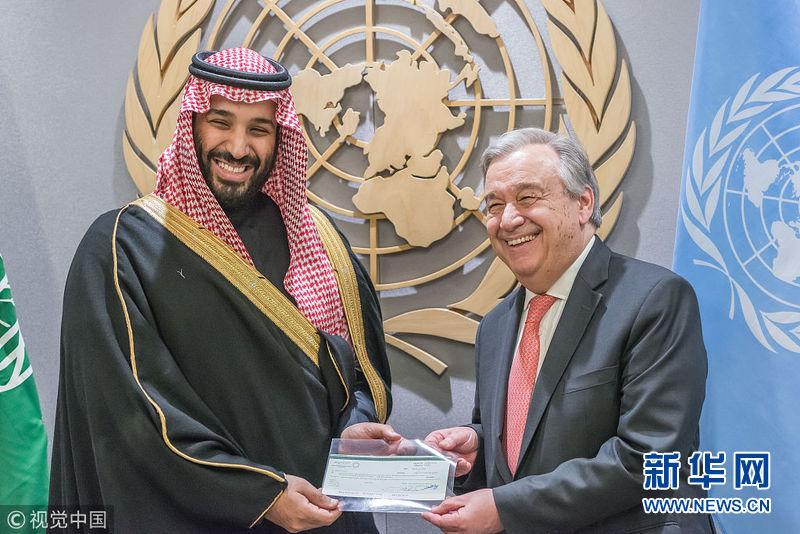 3月27日,美國紐約,沙特王儲穆罕默德·本·薩勒曼訪問聯合國總部,簽署向也門人道主義援助計劃自愿財政資助備忘錄。(圖片來源:視覺中國)