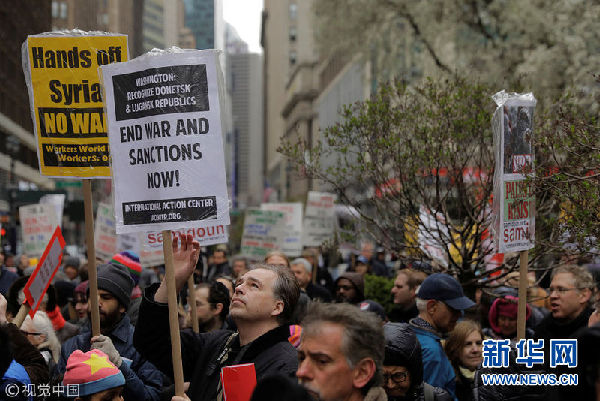 4月15日,美國紐約,民眾舉行反戰游行,抗議美英法聯軍襲擊敘利亞。2018-04-16 07:48:32