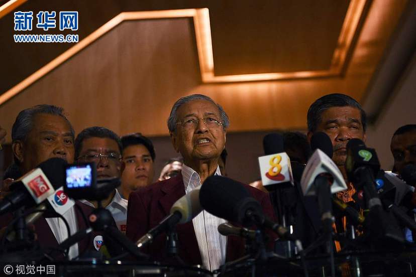 當地時間2018年5月9日,馬來西亞吉隆坡,馬哈蒂爾代表希望聯盟召開新聞發布會。9日,馬來西亞國會大選結束。10日凌晨官方點票結果顯示,前總理馬哈蒂爾(Mahathir)帶領的希望聯盟取得112席簡單多數國會議席,足以籌組政府及勝出大選,并終結執政國民陣線長達60年的管治。現總理納吉布領導的國民陣線僅獲得76席。(圖片來源:視覺中國)