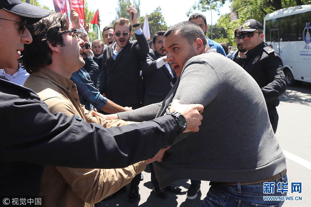 5月15日,土耳其安卡拉,示威者在以色列領事館附近投擲雞蛋和石塊,抗議美國駐以色列使館遷至耶路撒冷。(圖片來源:視覺中國)