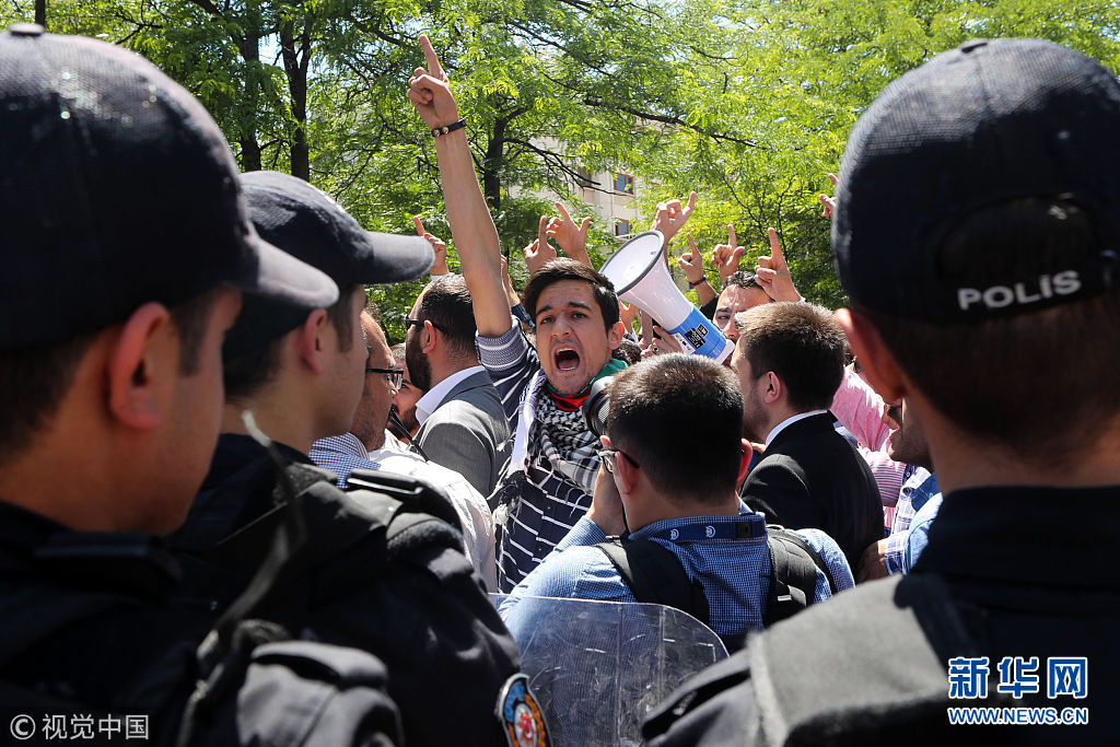 5月15日,土耳其安卡拉,示威者在以色列領(lǐng)事館附近投擲雞蛋和石塊,抗議美國(guó)駐以色列使館遷至耶路撒冷。(圖片來(lái)源:視覺中國(guó))