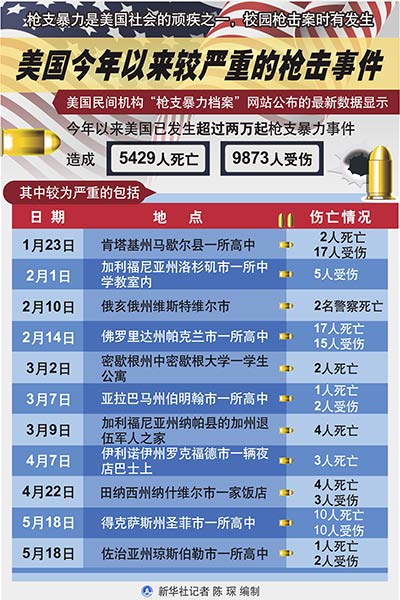 新華社北京5月19日電 新聞背景:美國今年以來較嚴重的槍擊事件