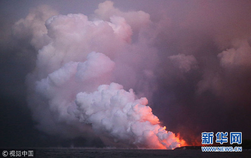 夏威夷火山熔巖流入太平洋 有毒“蒸汽云”升騰火光交映