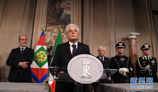5月27日,在意大利首都羅馬,意總統馬塔雷拉發表講話。據當地媒體報道,意大利新任總理孔特27日晚間與總統馬塔雷拉會面并提交擬定的內閣成員名單時,馬塔雷拉否決了由意大利聯盟黨和五星運動力推的持疑歐立場的經濟學家保羅·薩沃納出任財政部長。孔特向總統提出放棄組閣任務請求,請求得到總統確認。新華社發(阿爾貝托·林格里亞攝)