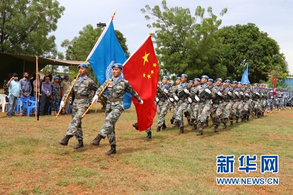 在隨后舉行的閱兵儀式上,中國維和部隊派出23名工兵組成的方隊。他們踏著雄壯的步伐,肩扛和平的旗幟,整齊地走過閱兵臺,展現了中國人民解放軍“威武之師、文明之師、勝利之師”的良好形象,受到聯合國在場人員高度評價。