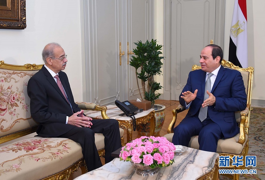 6月5日,在埃及首都開羅,埃及總統塞西(右)與總理伊斯梅爾交談。埃及國家電視臺5日報道,埃及總理伊斯梅爾當天向總統塞西遞交內閣辭呈。新華社/中東社