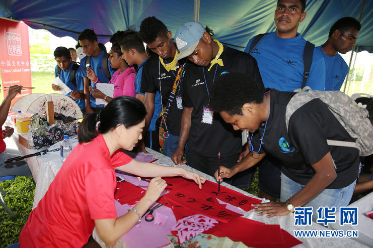 斐濟青年正在中國文化中心老師的指導下用毛筆寫自己的姓名。 新華網記者張永興 攝