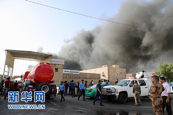 6月10日,在伊拉克首都巴格達(dá),伊拉克安全人員和消防人員在火災(zāi)現(xiàn)場(chǎng)工作。新華社發(fā)(哈利勒·達(dá)伍德 攝)