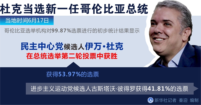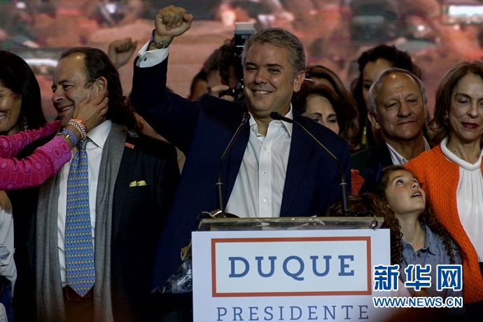 新華社波哥大6月17日電(記者何珊)哥倫比亞總統選舉第二輪投票17日在平靜中結束。右翼候選人杜克戰勝左翼候選人彼得羅,當選哥倫比亞新一任總統。杜克將于8月7日宣誓就職,任期至2022年。