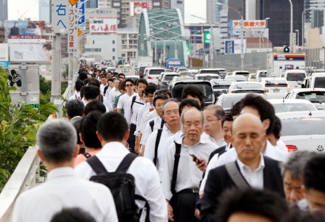 6月18日,在日本大阪,人們在火車和地鐵因地震暫停后步行經過一座橋梁。(新華社/美聯(lián))