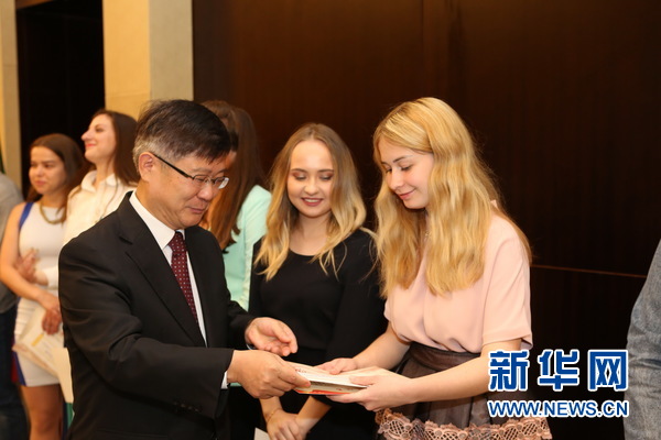中國駐白俄羅斯大使崔啟明向白俄羅斯學(xué)生頒發(fā)獎學(xué)金。新華網(wǎng)記者 魏忠杰攝