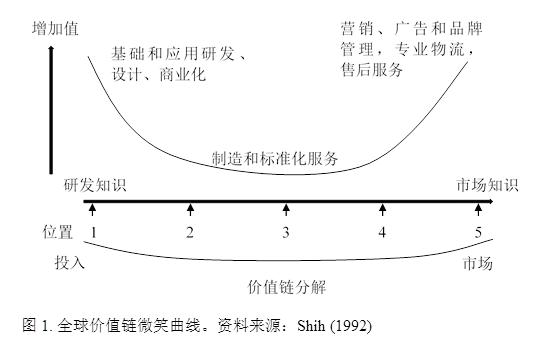 全球價值鏈構建了一個跨國或者跨地區(qū)不同公司實現(xiàn)不同的工序和商業(yè)功能的生產(chǎn)架構(Grossman和Rossi-Hansberg,2012)。這個架構是“生產(chǎn)性的(價值增長的)通向并且支持最終使用的順序” (Sturgeon 2001)。微笑曲線提出了一種不同的解構國際貿易的方法。有些國家專業(yè)化“生產(chǎn)”知識與研發(fā),而另一些國家專業(yè)化于制造業(yè),或者品牌營銷。因此,一個產(chǎn)品的增加值不再是完全屬于某一個國家,而是整條價值鏈上的參與者都可以分一杯羹。在為最終產(chǎn)品貢獻價值的生產(chǎn)工序的鏈條上(既,產(chǎn)品的價值鏈),一般的工序鏈條開始于基礎和應用研究與設計。這些研究與設計活動往往會帶來新的想法、技術、新產(chǎn)品設計和新的生產(chǎn)工藝。這個工序鏈條下一環(huán)節(jié)是商業(yè)化這些研究成果,如專利和知識產(chǎn)權(想法、論文、知識等);再下一環(huán)節(jié)是資源的獲取和材料的生產(chǎn)(包括農(nóng)業(yè)產(chǎn)品),零部件的生產(chǎn)和產(chǎn)品的組裝,以及最后環(huán)節(jié)的營銷、廣告、品牌管理、物流、商業(yè)服務和售后服務。另外,價值鏈在文獻中的定義是超出中間品貿易的,它強調在不同環(huán)節(jié)上領先企業(yè)與供應商之間的權力架構 (Milberg,2004)。