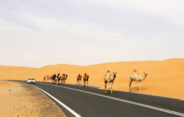 阿聯酋利瓦沙漠公路上的駝隊。新華社記者 李震攝