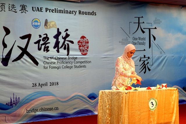 2018年4月28日, 第17屆“漢語橋”世界大學生中文比賽阿聯酋賽區預選賽上,扎耶德大學18歲的大一女生獲得冠軍。新華社記者 蘇小坡攝