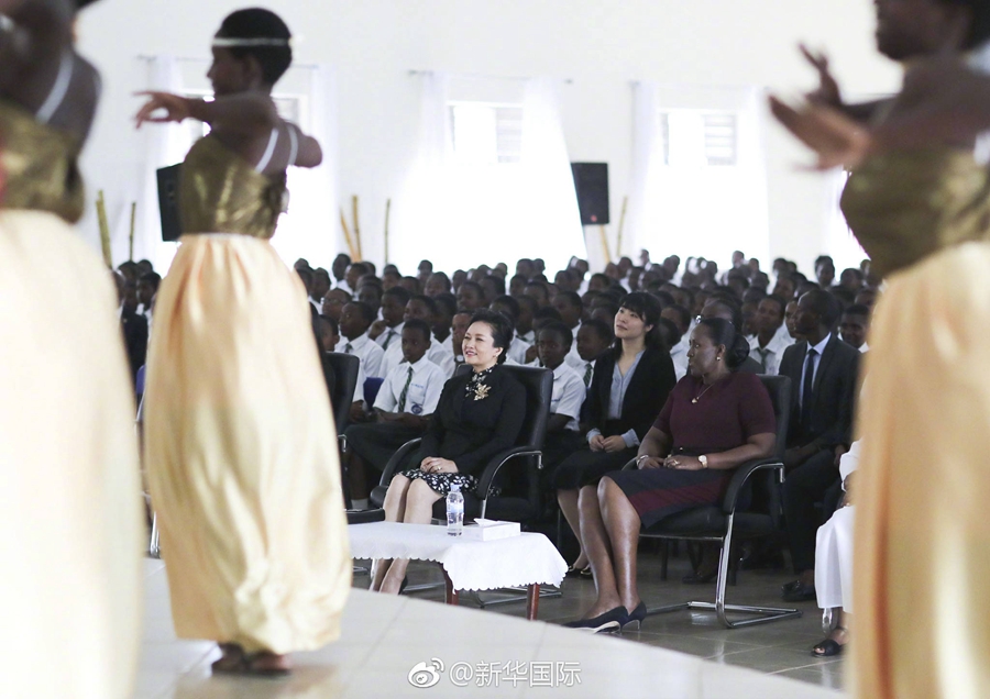 23日上午,國家主席習近平夫人彭麗媛參觀了盧旺達法維女子中學。全校師生聚集在學校大禮堂,歡迎中國貴賓到來。當彭麗媛走進會場時,掌聲雷動。同學們為彭麗媛呈上了一場精彩演出:學校校歌合唱高亢激昂、中國經典名曲《茉莉花》悠揚嘹亮、盧旺達民族舞蹈熱情奔放。彭麗媛不斷為學生的出色表演鼓掌。演出結束后,彭麗媛向學校贈送了一批教學用品,祝愿學校越來越好。一位同學向彭麗媛贈送了一幅自己專門創作的畫像。彭麗媛高興地接過畫像大加稱贊,親吻這位同學的臉頰,并同她親切擁抱。彭麗媛對全校師生的熱情接待表示感謝。