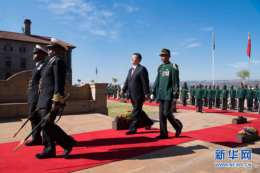 總統府前廣場,微風拂面,陽光和煦。中南兩國國旗迎風飄揚。習近平和夫人彭麗媛受到拉馬福薩和夫人莫采佩熱情迎接。兩國元首夫婦登上檢閱臺。儀仗隊行持槍禮。軍樂隊奏中國國歌。現場鳴放21響禮炮。習近平檢閱儀仗隊。軍樂隊奏南非國歌。習近平和彭麗媛同南方主要官員握手。拉馬福薩夫婦同中方陪同人員握手。兩國元首夫婦親切寒暄。拉馬福薩對習近平在南中建交20周年之際訪問南非并出席金磚國家領導人會晤表示熱烈歡迎。