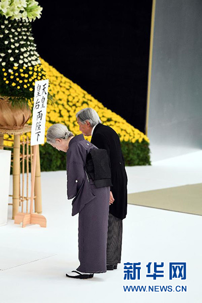 8月15日,在日本東京,日本明仁天皇(右)和皇后美智子出席“全國戰歿者追悼儀式”。 新華社記者馬平攝