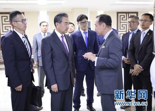 8月25日,在蒙古國首都烏蘭巴托,中國國務委員兼外交部長王毅(前中)在蒙古國外長朝格特巴特爾(前右)的陪同下專程來到烏蘭巴托成吉思汗國際機場考察“一帶一路”快速通道并現場了解情況。 新華社記者阿斯鋼攝