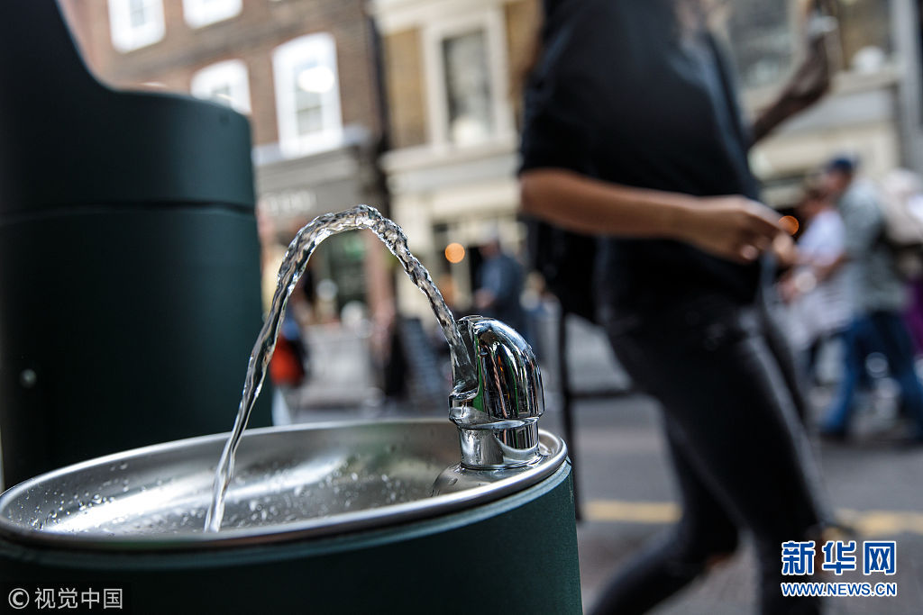 當地時間2018年8月28日,英國倫敦,民眾在公共飲水機旁飲水。倫敦市長近日引進了20個新的公共飲水機,鼓勵人們自帶杯子取水喝,從而減少塑料垃圾。 (圖片來源:視覺中國)