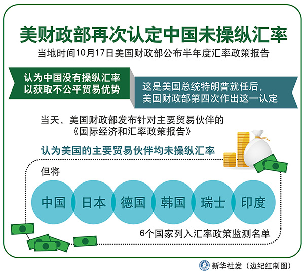 新華社華盛頓10月17日電(記者楊承霖 高攀)美國財政部17日公布半年度匯率政策報告,認為中國沒有操縱匯率以獲取不公平貿易優勢。這是美國總統特朗普就任后,美國財政部第四次作出這一認定。